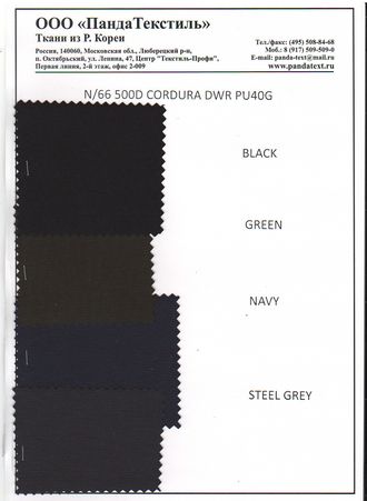 Cordura 66D 6.9 USD Ткань: Cordura 66D Плотность 190 гр. Состав: 100% нейлон Ширина рулона: 1,5 м Цвета в наличии: в ассортименте Цена 6.9 долл за пог.м Страна: Ю. Корея